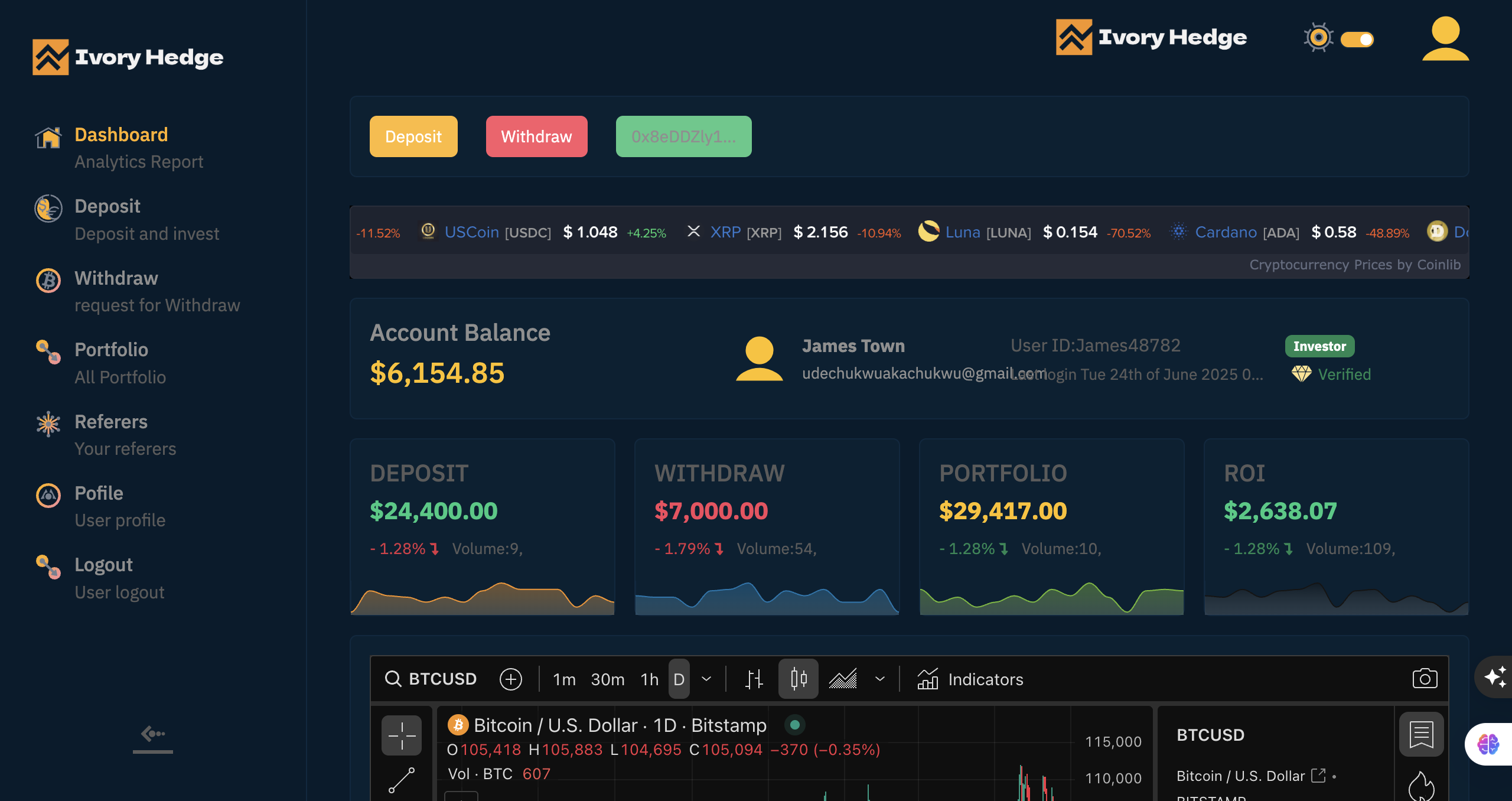 Welcome to Ivory Hedge, your trusted gateway to the world of digital finance. Our platform is dedicated to providing a secure, transparent, and user-friendly experience for buying, selling, and managing cryptocurrencies. With a focus on innovation and accessibility, we empower users to participate in the global digital economy with confidence. We offer real-time market data, advanced trading tools, and educational resources to help you make informed decisions. Join us in exploring the future of finance and discover the potential of blockchain technology with Ivory Hedge.